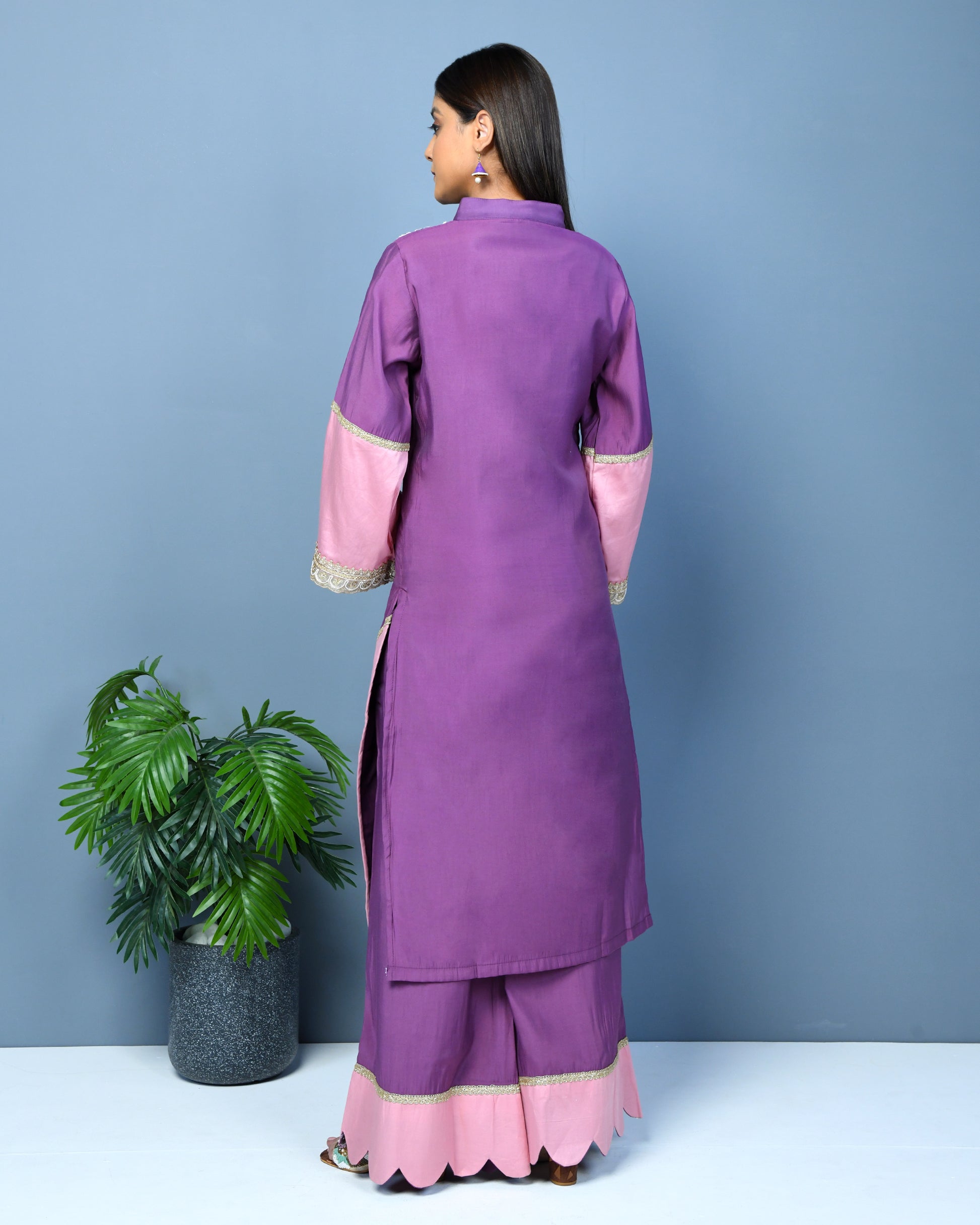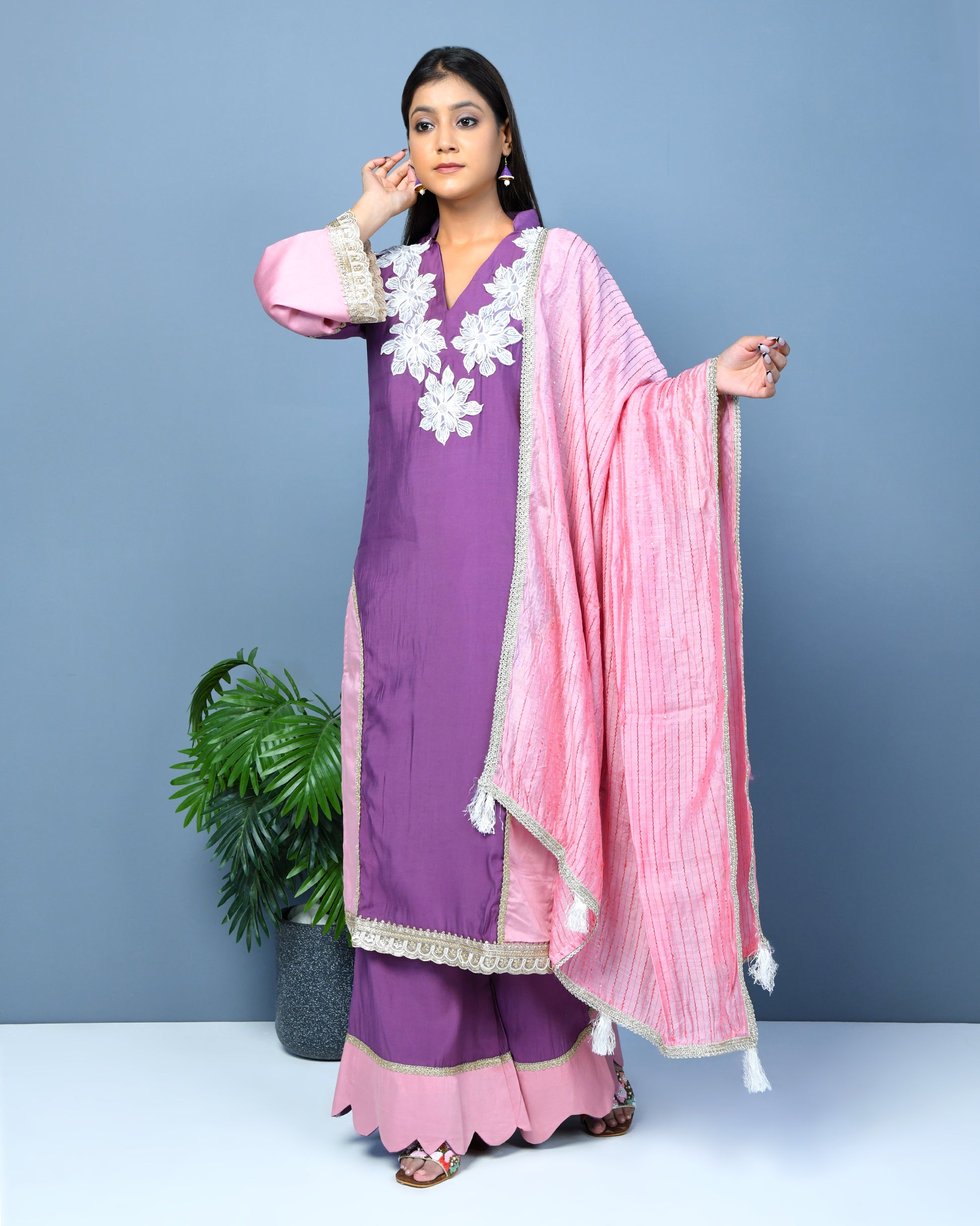This stylish two-tone kurta set features a rich deep purple base with dusky pink contrast sleeves and pant hem. The neckline is adorned with white floral applique embroidery, adding a striking yet elegant focal point.