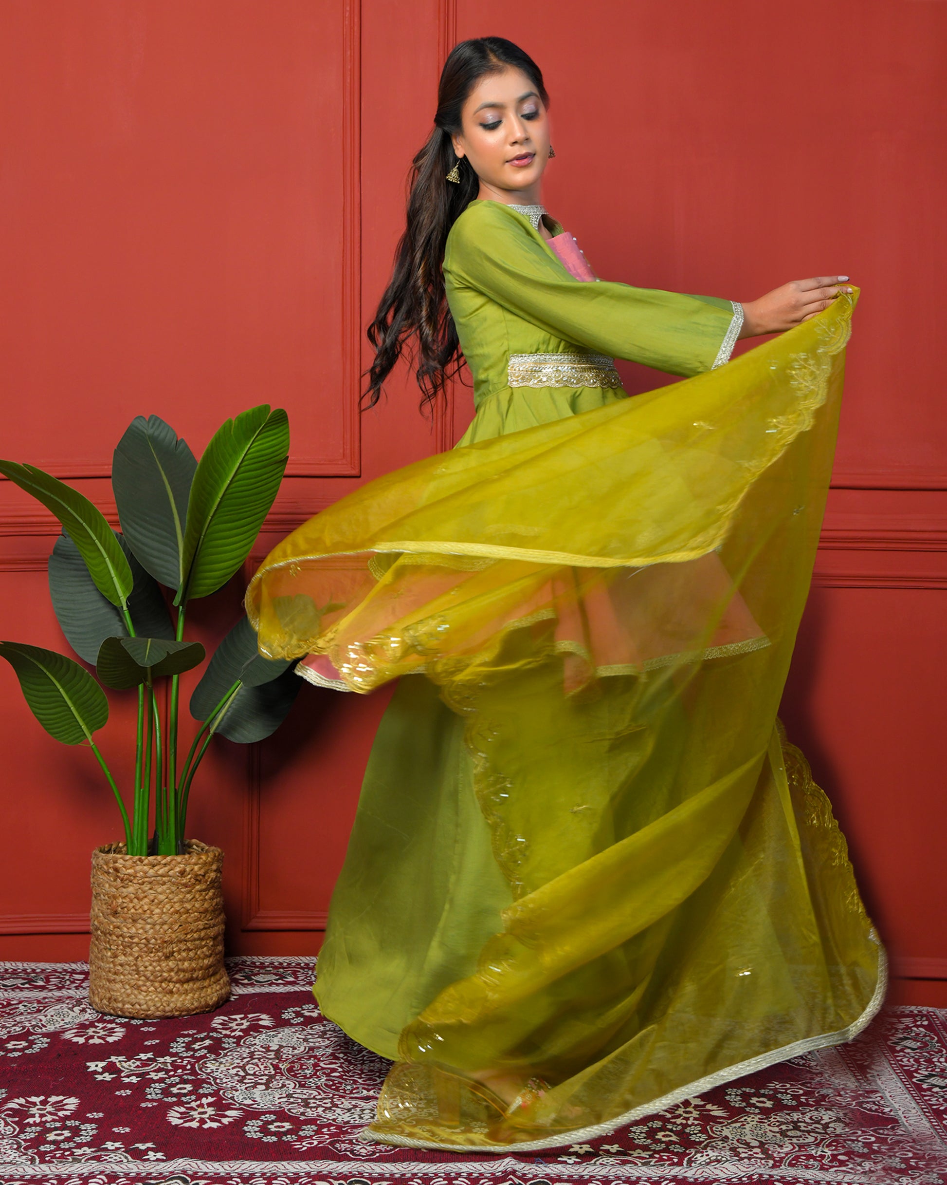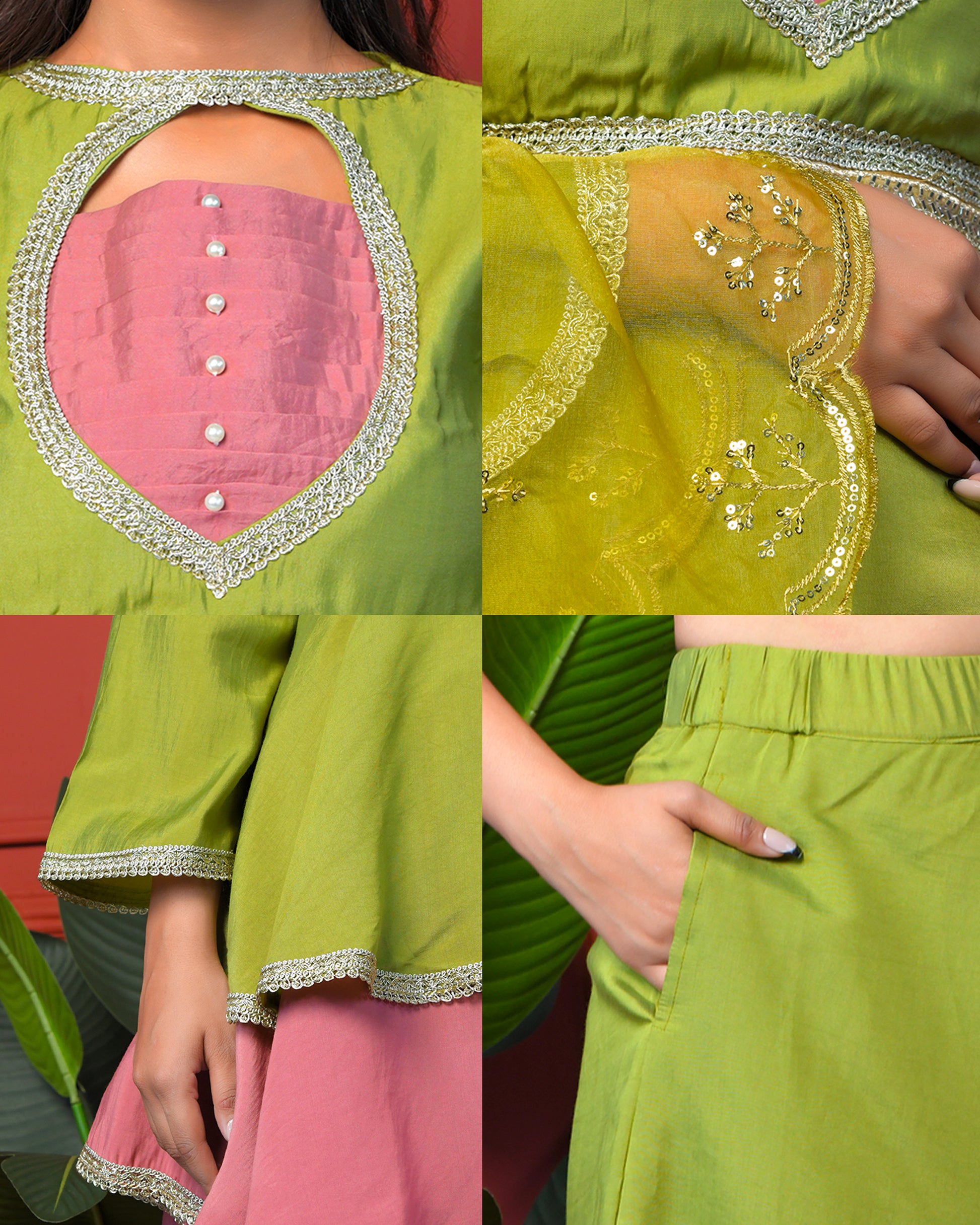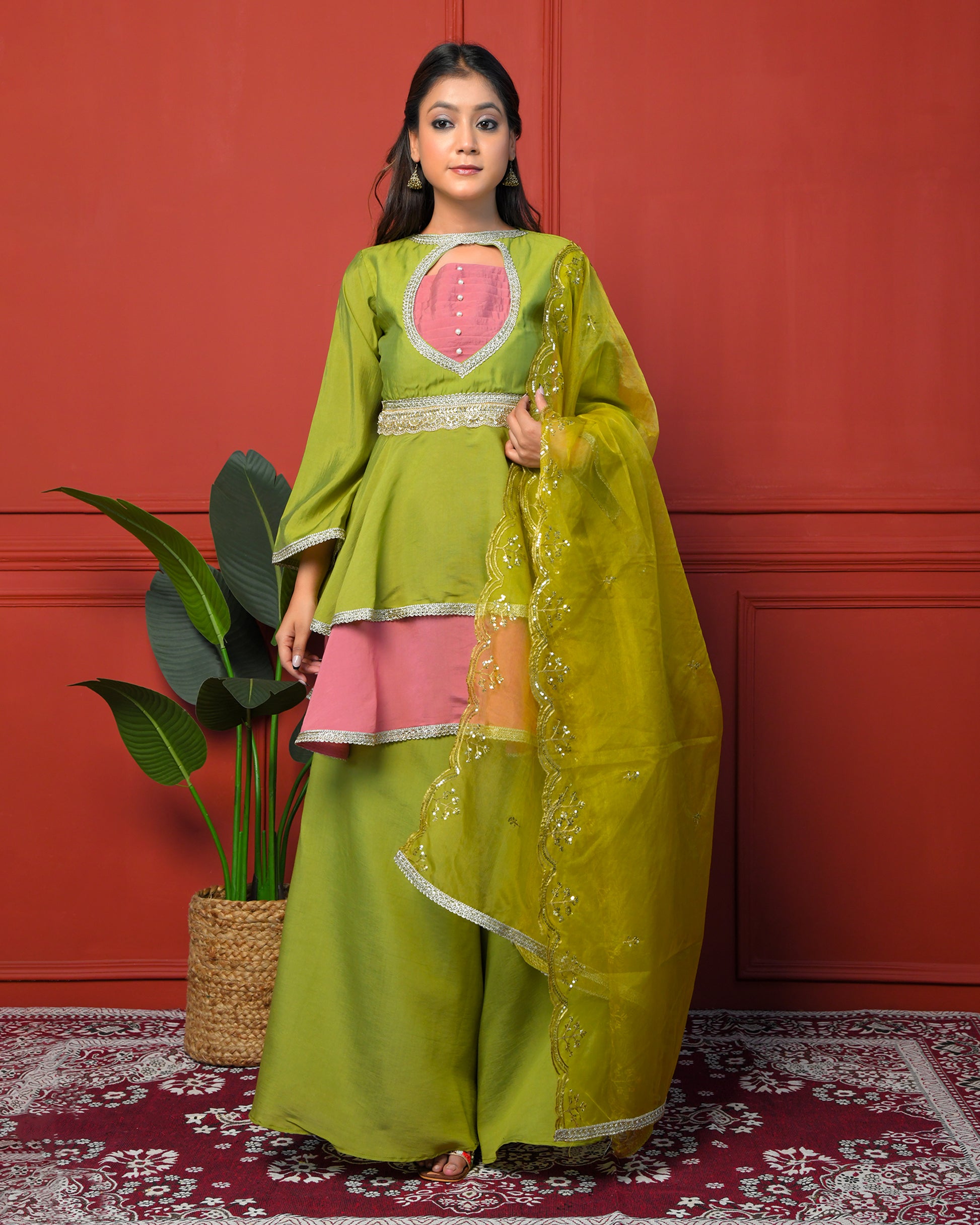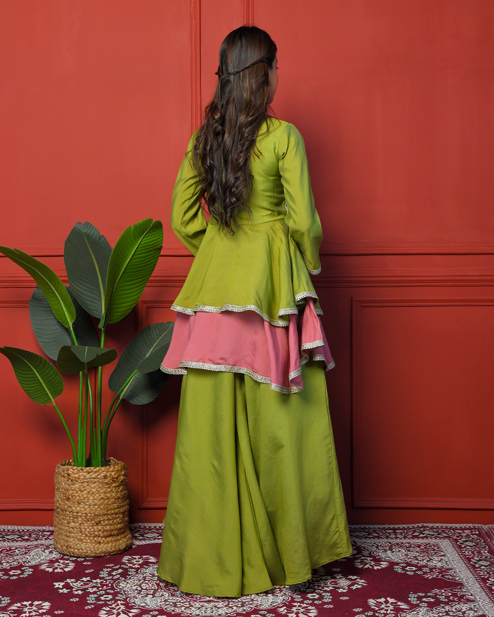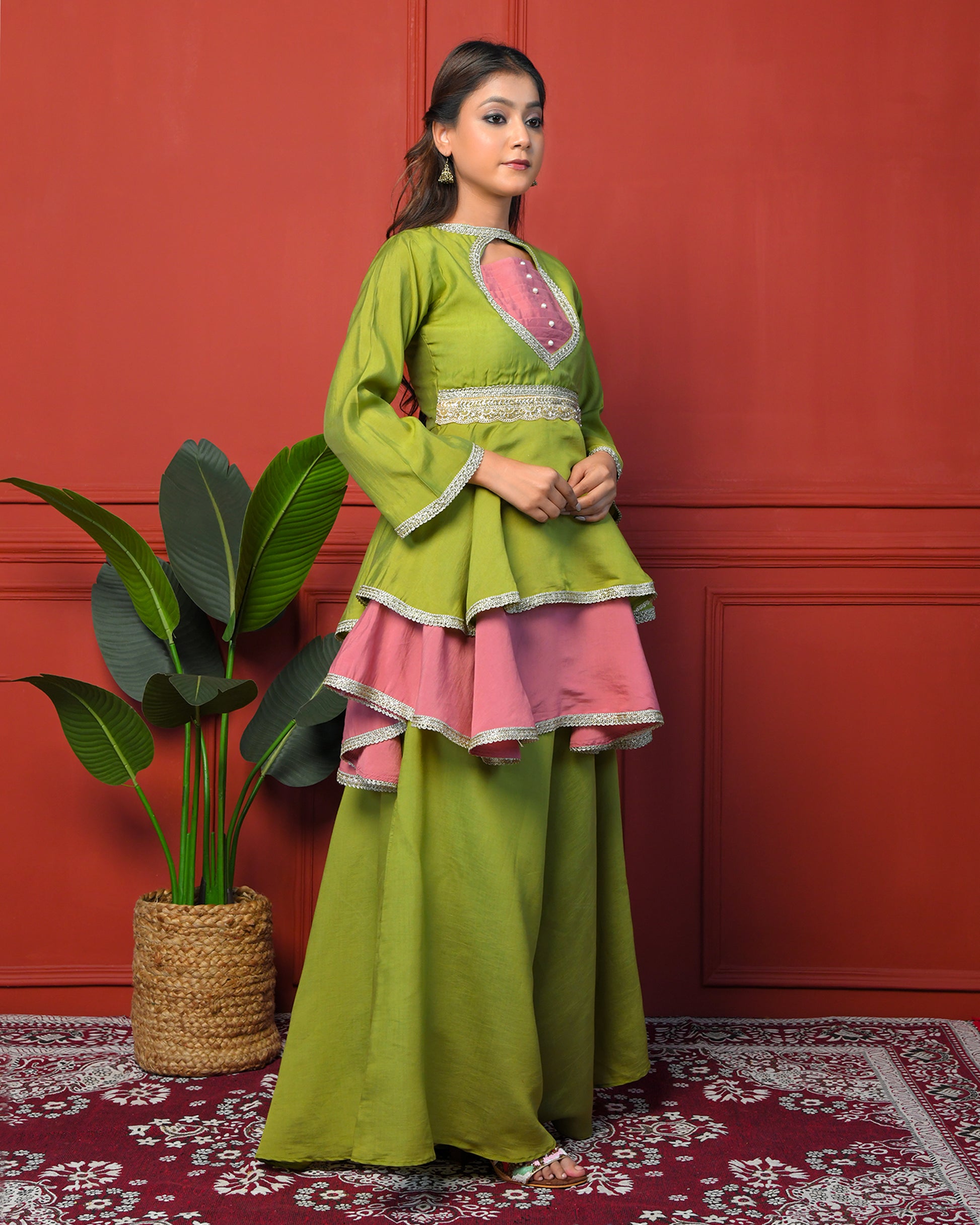A stylish Indo-Western sharara set in green and blush pink, featuring an oval-shaped neckline inset, layered peplum design, and gold lace detailing.