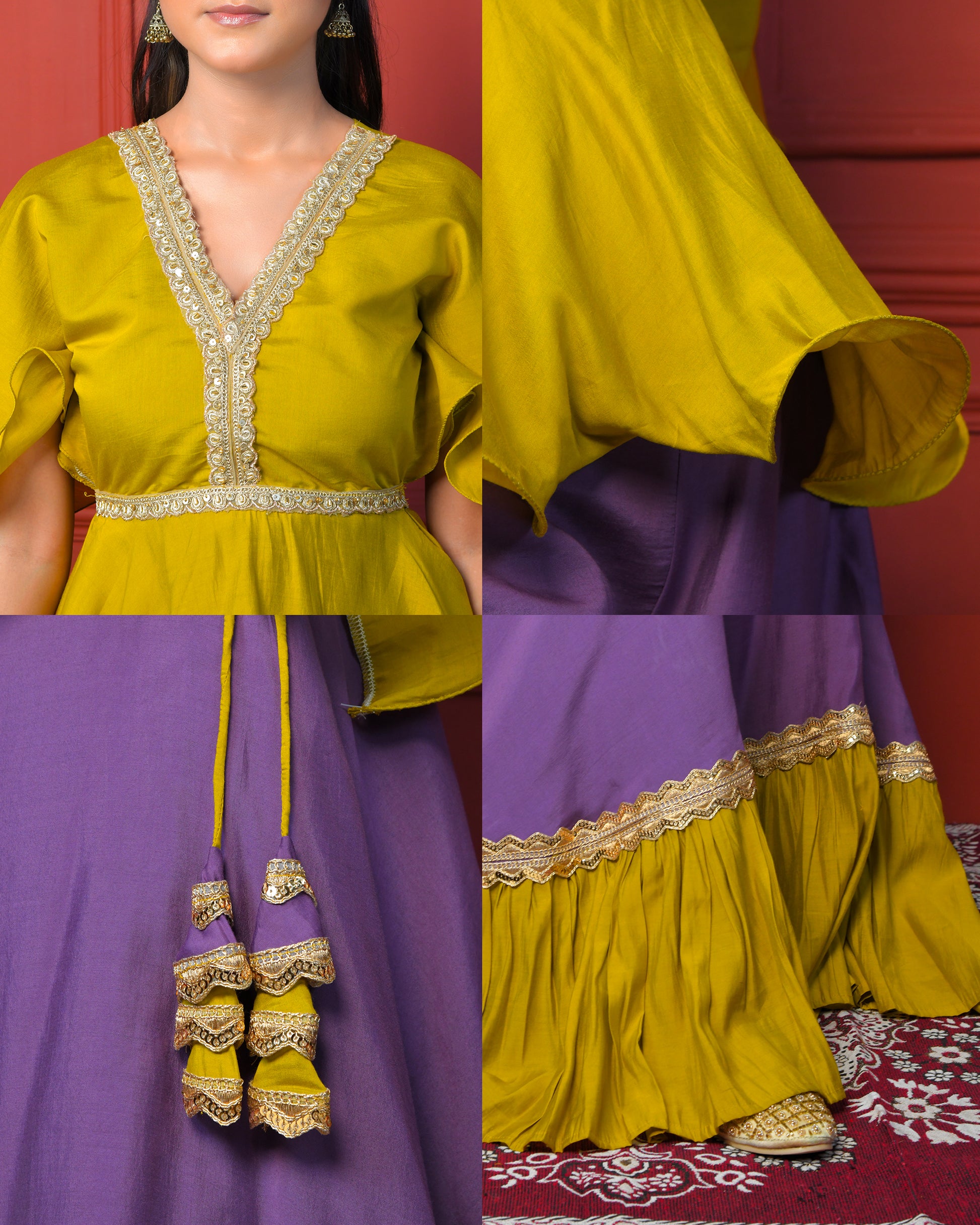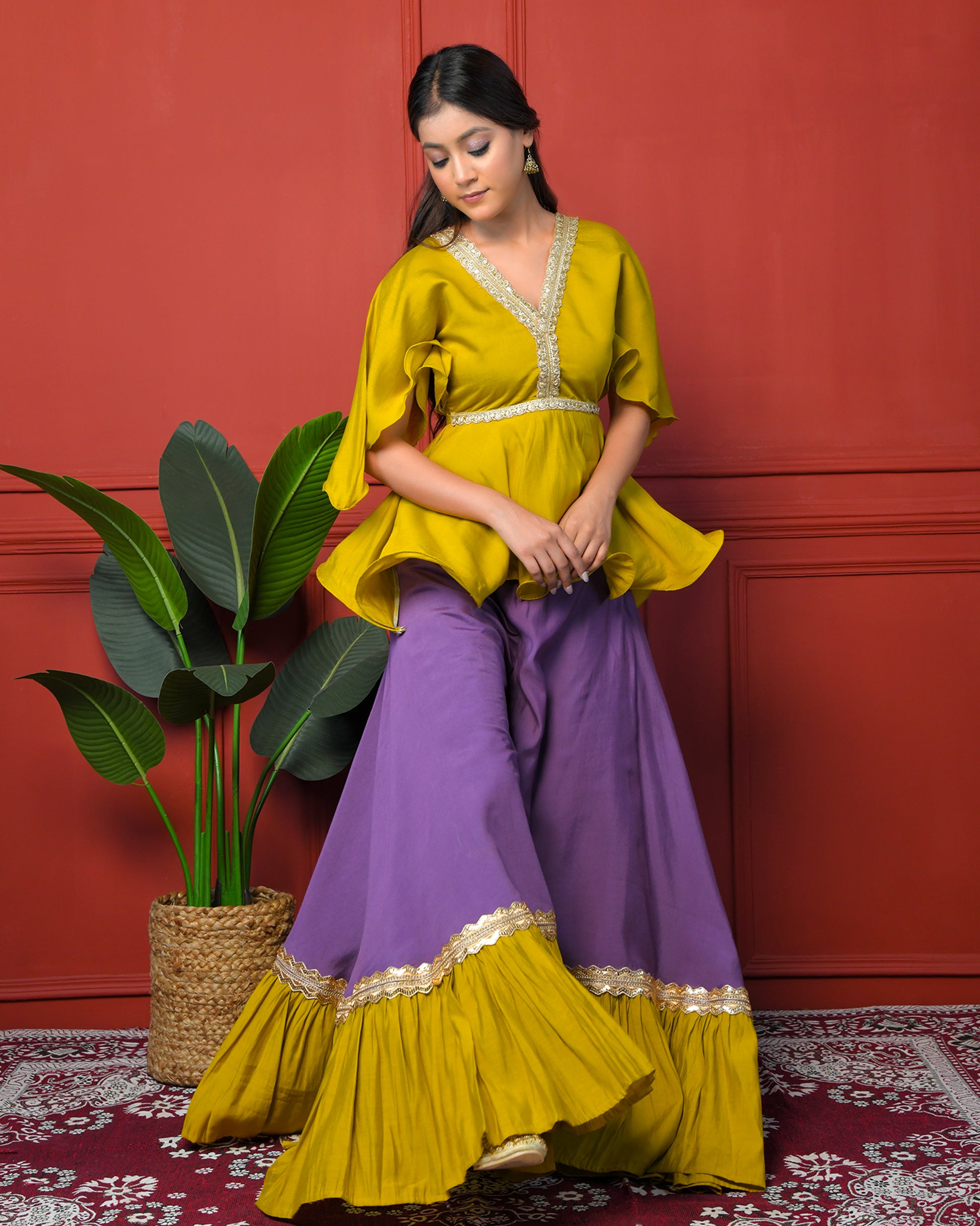 The waist is highlighted with an embroidered belt, flowing into wide plum-hued flared bottoms accented with ruffled hem and golden lace.